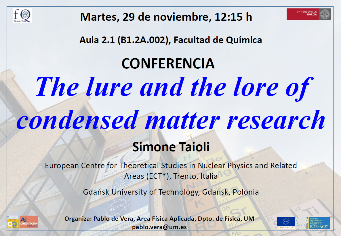 El próximo martes 29 de noviembre tendremos la interesante charla del Dr. Simone Taioli (Centro Europeo de Estudios Teóricos en Física Nuclear y Áreas Relacionadas, Trento, Italia, y Universidad Tecnológica de Gdansk, Polonia), titulada “The lure and the lore of condensed matter research”. Estáis todos invitados a asistir.